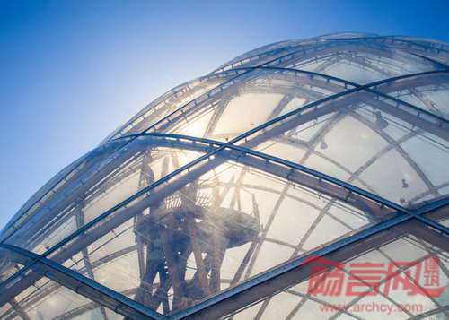 丹麦C F Moller建筑事务所设计了奥胡思的一个穹顶热带温室。温室的外立面是半透明塑料枕状物,充气后可以改变内部的温度和光线。设计师同FormT膜结构制造商共同设计了奥胡思植物园内的聚氟乙烯材料温室。该材料赋予建筑节能的围护结构,包裹了18米高的温室。通过升降枕状物内部的气压,建筑内的光线和温度可得到调节,同时外立面的透明度也随之变化。