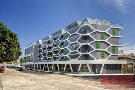 TONY OWEN建筑事务所完成了位于澳大利亚悉尼郊区的Alpha Lewisham住宅楼设计。设计灵感来自自然界中的蜂巢结构,基于模块化的住宅楼涵盖70套公寓。项目成为Mcgill总体规划的基石,这一规划也由TONY OWEN建筑事务所完成。六边形外立面营造了环境屏障,可控制进入光线和视野。建筑共有七层,室内区域包含公寓、多层公共区域、零售商业空间。一至五层涵盖了一室户和两室户公寓,六层和七层包含复式的空中住宅,提供俯瞰城市和周边公园的广阔视野。