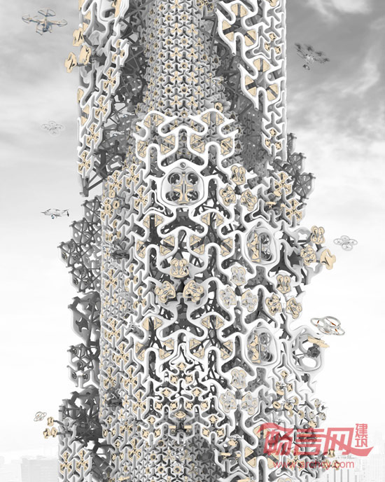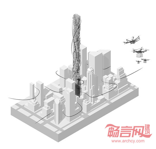 设计师Hadeel Ayed Mohammad, Yifeng Zhao and Chengda Zhu提出了一座位于纽约曼哈顿中心的摩天大楼设计方案,该大楼将用作无人机控制站,可用来停放无人机和为无人机充电。