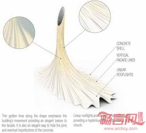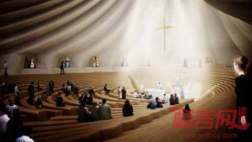 教堂高耸的结构从城市文脉中脱颖而出,建筑漏斗形状提升了声学效果,增添了宗教气氛。建筑其他包括医疗、告解和社区在内的服务区域均位于地下层。建筑背部区域保留空间用于圣器保存、更衣室、办公室和小型图书馆和工作区。