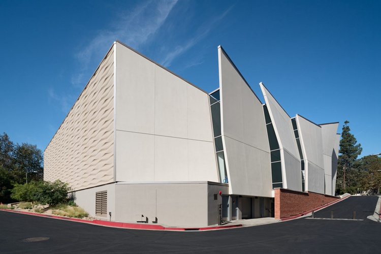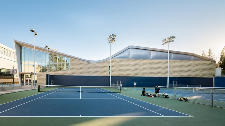 加州Kevin Daly事务所设计了UCLA大学篮球馆。该项目名为Mo Ostin篮球中心,供大学男女篮球队共同使用,两支球队都排名全美前五位。建筑设有翅状的墙板机构和流畅的屋面线条,设有多个天窗。项目总面积达37万平米,采用了斜面墙板和波浪形、砂岩状外立面。坐落在角落位置,该训练中心采用薄层玻纤增强混凝土定制板材,采用场外预制,营造了温暖的流畅形态。