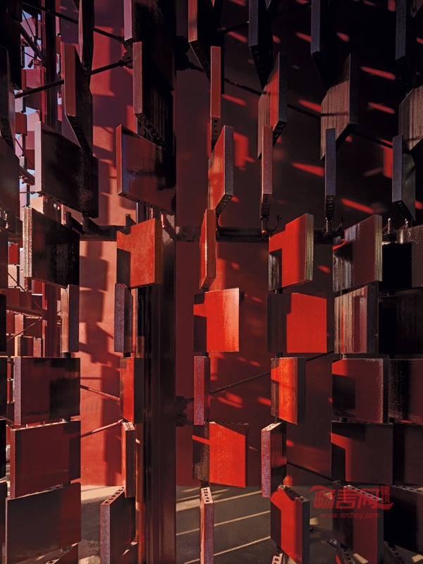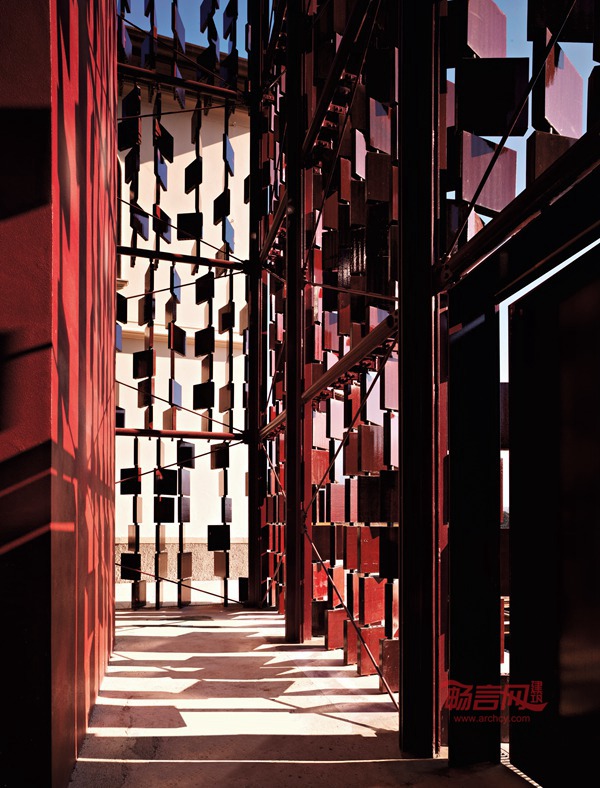 新增加的一翼通过地下空间与现有建筑相连接,并与老的结构脱离.这样的空间组织在建筑意义上强调了新与旧的对比.新建部分的外立面由规格为40 x40厘米的陶土砖组成,陶土砖表面深红色釉化处理,由成对的钢构件固定。这样的立面构成使得建筑成为一个完全通透的体量,外立面本身可以作为遮挡或过滤阳光的装置。