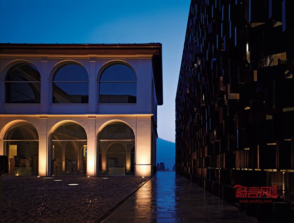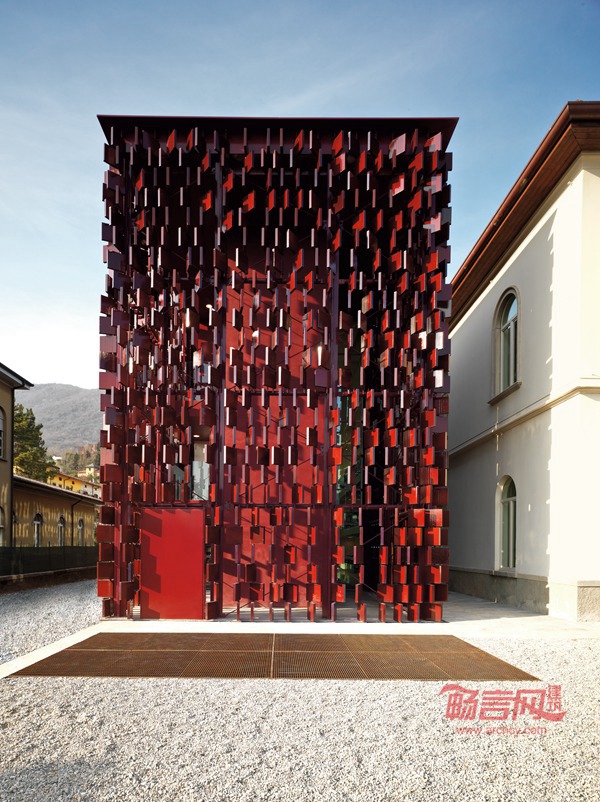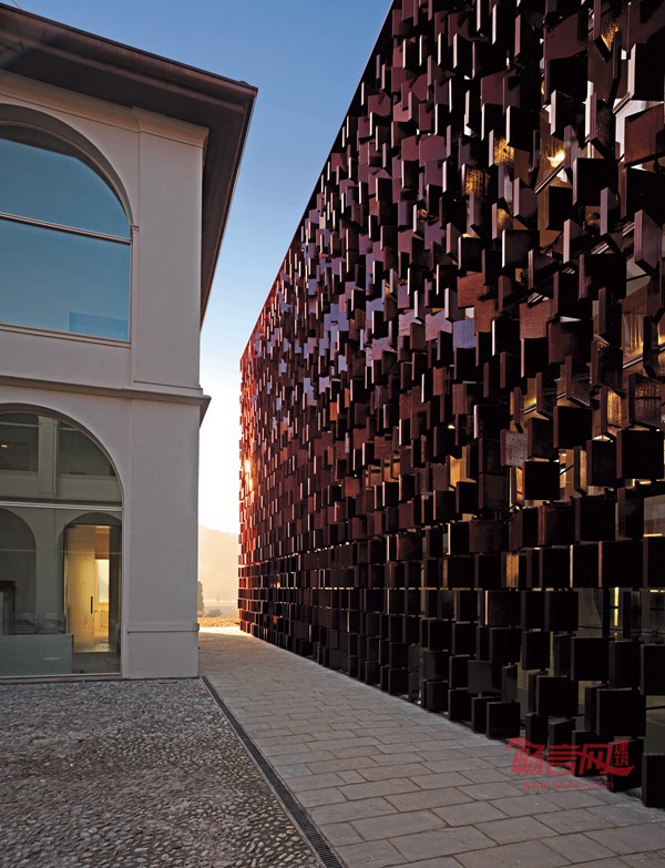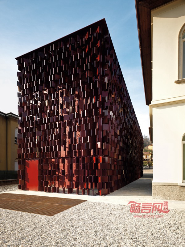 位于意大利贝加莫市的市政图书馆始建于1897年。起初是一个小学,历经多年演变,建筑用途也发生多次改变。从小学到市政厅、托儿所以及后来的医院门诊部,到现在的公共图书馆。市政府决定为市民提供一个进行学习和获取知识与信息的场所,由阿克雅建筑师事务所(Studio Archea)负责项目的改造设计。考虑到该建筑包裹着一个三面环绕的中央庭院,项目改造既充分尊重原有建筑的结构和形式,又要使构建的新街区与旧的中央庭院形成一个内部式的可供读者自由活动的区域,经过设计改造后,形成一个单体与旧有的中央庭院地基相连,但与其在外立面结构上完全独立。设计风格除了体现与原有建筑的关联性外,还着重体现出了新建筑与旧建筑的差别化。该建筑的外立面均设计成镂空的像一本本书本似的钢筑结构,此设计有助于提升视觉美感与通风,外立面装饰材料完全采用红色的陶瓷砖,此外装材料使得图书馆在白天日照下显得熠熠生辉,光彩夺目,具有艺术美感。此建筑已于2007 年3 月24 日开始正式对公众开放。