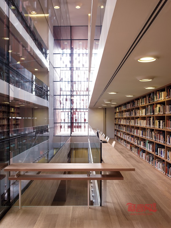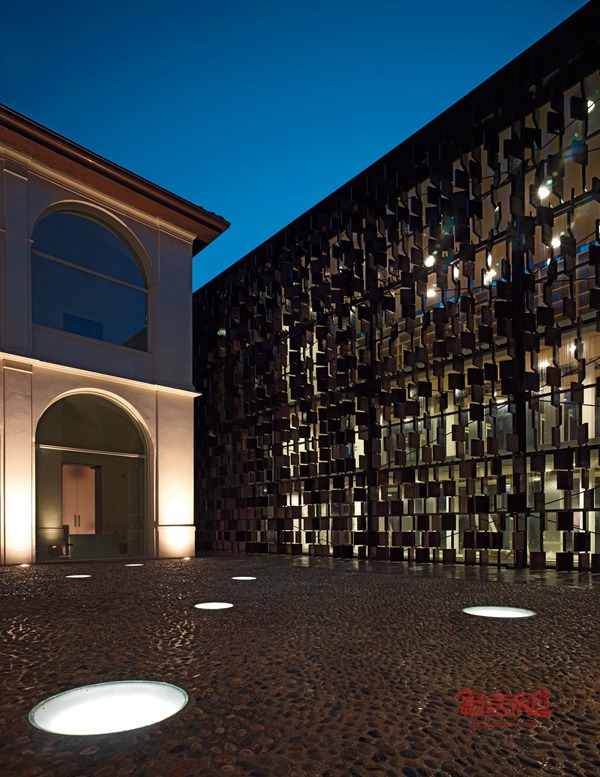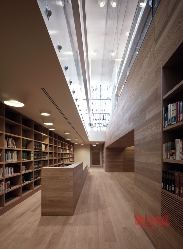 这层特殊的“幕墙”结构保护了里面的玻璃体量,同时成为内外空间的界限.。外立面的这种特征在各个面上均得以表现,在每块陶土砖的开合转动之间,创造出一种连续的韵律。事实上,陶土材料的运用在突显传统建造技术的同时,,最终的效果也极富现代感,建筑可以被从不同角度阅读,其特殊的空间语言通过光影的变化,建造的质感,结构的统一以及材料运用与色彩共同作用来表达。新图书馆的入口位于意大利广场,也就是原来学校的主要入口,参观者首先进入一个接待区以及信息服务的区域,此区域在现状的基础上凸现出宽敞与高雅的内部装饰风格,并反映出该图书馆的公用功能。