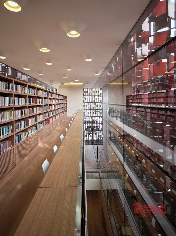 由前台区域进入走廊,较好的采光角度,并可以从此去往与之相连的图书馆内的不同功能的房间。该区域还呈现出一种连续性的展示效果,读者可以通过咨询空间进入各阅览室。位于地下宽敞的大厅备有电脑以便读者进行查阅,并与新的体量相连接,此新的体量内具有多条通道可通往阅览室。旧有建筑的一层和二层主要作为儿童阅览室,信息查询室,报刊阅览室以及多功能大厅,同时新的翼状建筑的统一结构主要功能是服务于图书存放以及阅览室。 超过9米的书柜的结构为特点,这个新的体量成为了以书本为建造设计特点的知识财富的象征;并且通过两个结构上突出的以汲取知识为主要功能并且可以俯瞰外立面的读书休闲区域来保证了新的建筑可接近的三个层次。