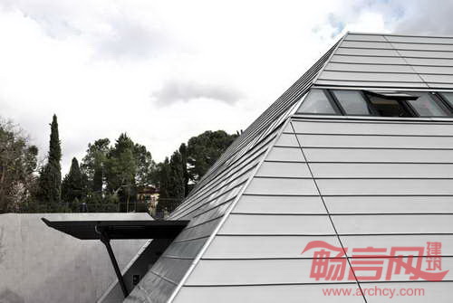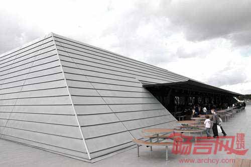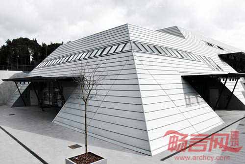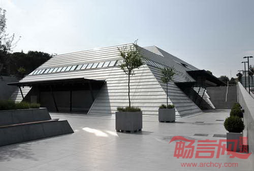 意大利Francesco Napolitano建筑事务所同LAD工作室合作设计了罗马The Stealth购物中心广场项目。项目外形如同古埃及坟墓,平顶建筑外侧坡面覆盖了钛锌合金材料。设计回应了该地区场地中常见的自然坡面,建立起建筑和环境之间的联系。建筑入口在外墙板后方,向上折叠,在不使用时极具安全保障。