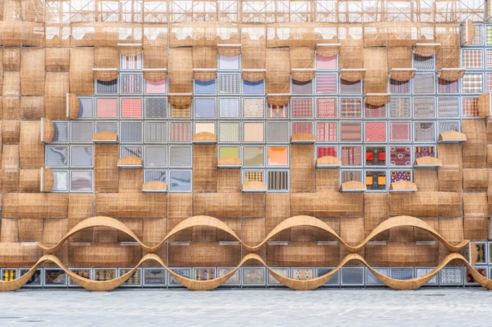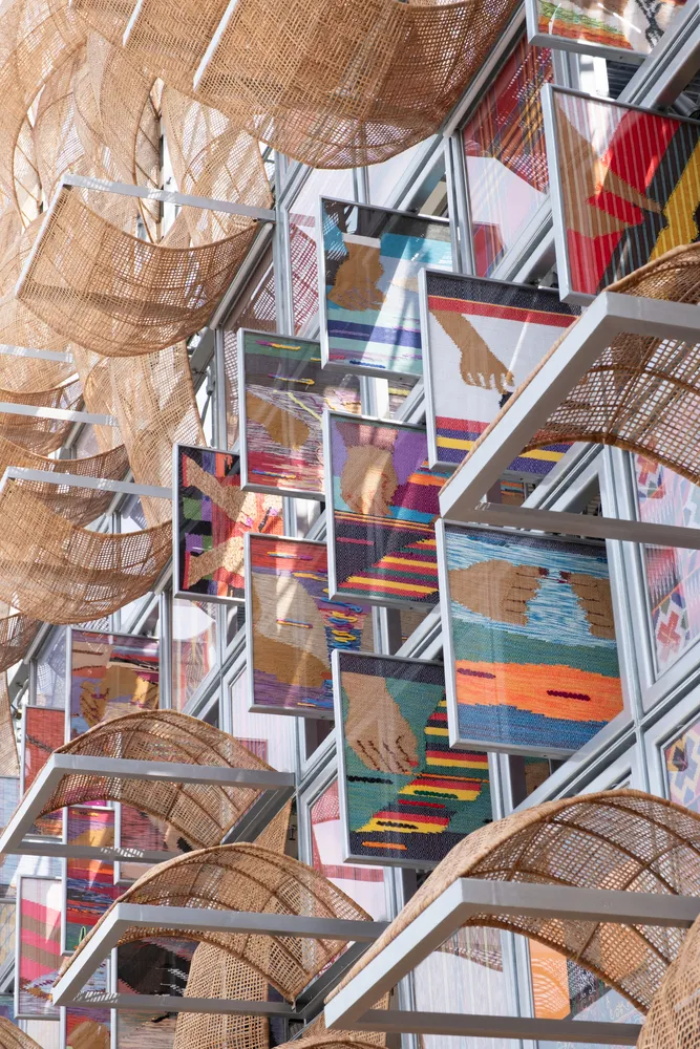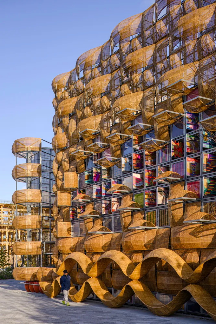 展馆的设计灵感源自菲律宾编织艺术,旨在象征相互联系与坚韧不拔。其建筑结构模仿了“经纬交织”的形态,象征着团结、力量与进步。展馆由 1000 多根藤条编织而成,并饰有 212 块手工编织的面板,将传统编织工艺提升到了建筑规模,打造出一座以象征性延展的线条表达持续进步的建筑。