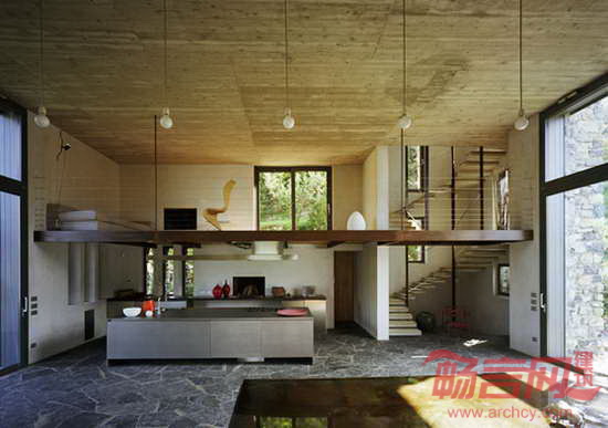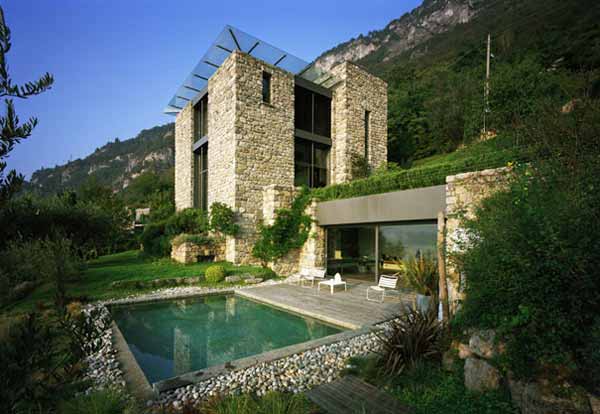 项目由建筑师Arturo Montanelli设计,是一座将自然风光完美融入住宅设计的建筑。项目坐落于坡地环境中,其坚固的石质基础具有强烈的重力感。石质住宅尽管有些冷酷,却也有温馨的特质,设计师将石材同清水混凝土、石灰石、天然木材、裸露的横梁相结合,呈现出原始自然的外观。壮丽的COMO湖景以及意大利乡村景致一览无余,增添了住宅的自然魅力。一层明亮开敞,拥有双倍层高的起居室和落地窗。二层卧室具有宁静和私密性。这座当代建筑拥有强烈的地中海风格和纯正的石材住宅设计特点。