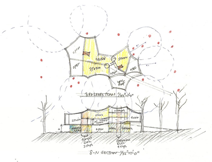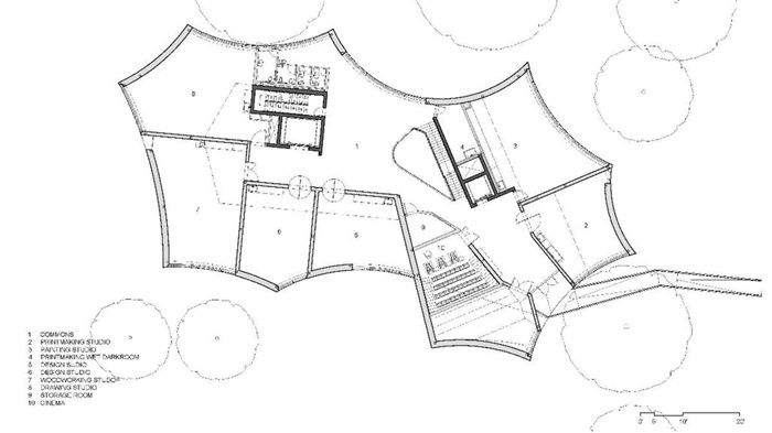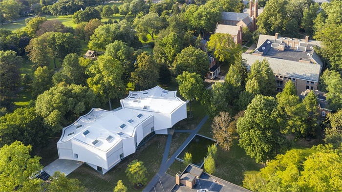 设计团队以周围200年树龄的树木为模板进行了几何渲染。设计师表示,”我们把树木几何结构看作新艺术建筑塑形的方式。新展馆并未呼应现有的长方形艺术建筑,而是根据校园中的大树做了艺术生成。”