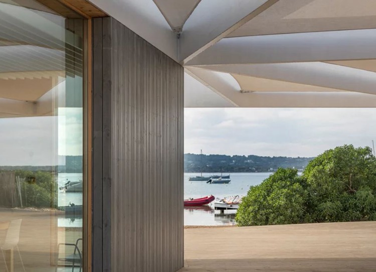 受项目双重属性影响,设计师奖建筑分成两个独立部分,分别是教室、办公室和工作室、更衣室。两个空间朝向不同的道路,道路交口设置了开敞空间,均拥有滨水视野和设有顶盖的聚会空间。