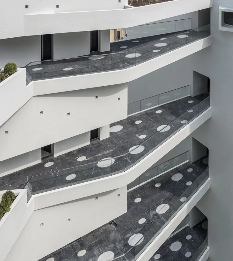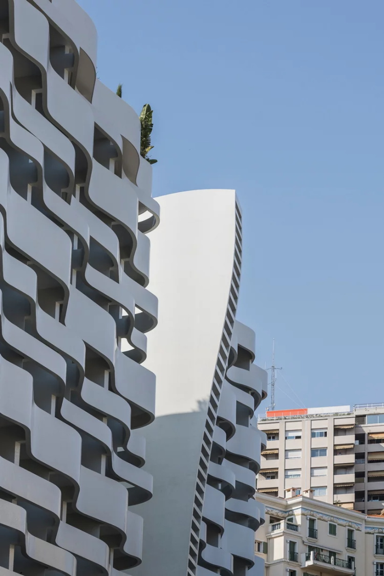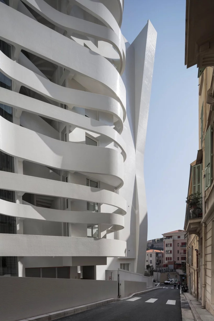 Jean-Pierre Lott设计了摩纳哥康达敏(La Condamine)中心地区的Le Stella大厦。这是一座外观醒目的建筑雕塑,在老城商业区中央,多功能建筑特色的流动、熠熠发光的外立面。项目分成两个流线型部分。两层的玻璃裙楼容纳商业功能、学校和办公场所。上方是外墙带有白色马赛克的伟岸、连贯的公寓空间,其连续的室外走廊非常显眼。
