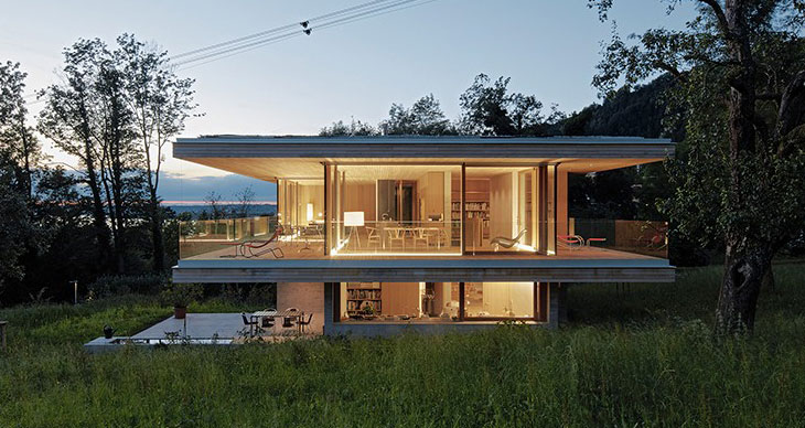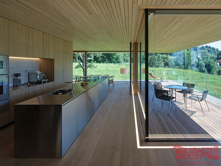 Dietrich Untertrifaller设计了奥地利D Bregenz住宅。项目位于山脚的项目俯瞰Bregenz,业主是一个四口之家。设计顺应其文脉,营造出显眼的外形,并自然融入周边环境。这一理念反映在三层空间的几何设计上。建筑结构注重细部处理,符合奥地利该地区闻名的手工工艺传统。建筑带有开放式布局,提供向乡村湖光山色敞开、一览无余的视野。三层区域分工明确。超大尺寸的平屋面和二层为下方露台提供遮蔽。入口和设备区设在一层,二层为主卧、客卧和儿童房等卧室空间。三层是餐厅、厨房。室内应用了木质饰面,方便家人团聚和朋友来访使用。三层露台围绕了整个住宅外围。