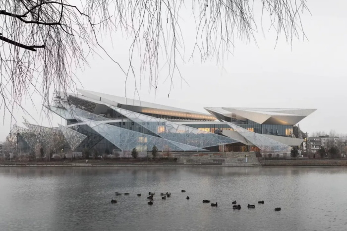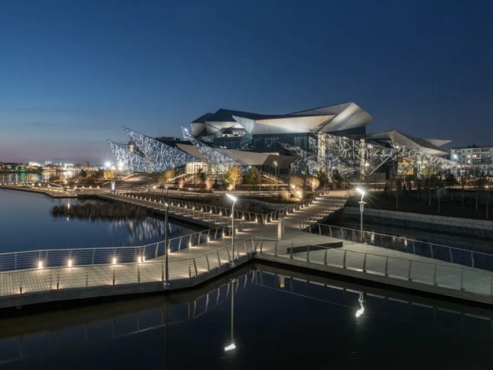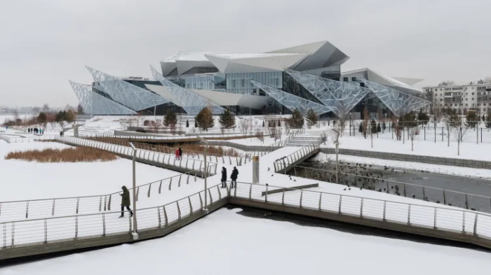 喀山卡马尔剧院(Kamal Theater)的建筑原型是一朵冰花:喀班湖(Lake Kaban)上这一罕见而脆弱的自然奇观,被“凝固”在了环绕主体建筑的玻璃幕墙那宏大而高耸的轮廓之中,勾勒出建筑的轮廓,并为彩色玻璃窗遮挡阳光。