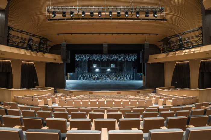 主厅设有两个阳台与三层看台,可容纳 771 名观众,外观庄严肃穆,整体采用极简风格打造。拱形穹顶、柔和的曲线造型以及淡雅的色调,令人联想起清真寺建筑。主舞台采用浅色橡木装饰,而门板则饰有精致细腻的图案。