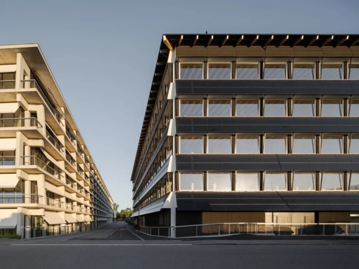 位于阿尔施维尔的瑞士创新园是生命科学企业的聚集地,目前仍在不断发展壮大。可持续的霍尔图斯(Hortus)办公楼为落户巴塞尔大都市区的新一代科技公司打造了一个现代化且灵活的工作环境。森恩(Senn)委托赫尔佐格&德梅隆事务所设计一座采用可再生和可回收建筑材料建造的、极具可持续性的办公楼。该设计任务书开启了一个设计流程,旨在将施工过程中的最低灰能(指在建筑物的建造、维护和拆除过程中所消耗的不可再生能源)、运营期间的节能优化理念以及自产能源的盈余相结合。这座拥有约 600 个工作场所的建筑,在 31 年后将完全抵消其建设过程中所消耗的能源。赫尔佐格&德梅隆事务所与森恩以及一支经验丰富的专业规划师团队合作,打造出了德语世界中最具可持续性的办公楼之一。