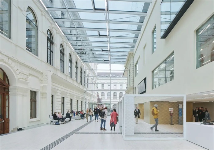项目拆除了建于 1970 年代的扩建部分后,发掘了隐藏在下面、位于图书馆北侧的历史立面,并重新在前面打造了通透的公共空间,连接了图书馆与历史建筑。新建筑不仅达到了 21 世纪图书馆设计的标准,也将不同的结构、功能、房间、风格结合成为统一的整体。建筑师 Thomas Pucher 还为图书馆设计了透明的中庭,以此连接图书馆和大学的主楼,并将多年来不同风格的扩建、增建部分合为一个整体。
