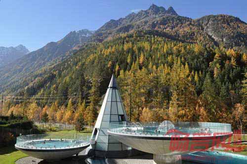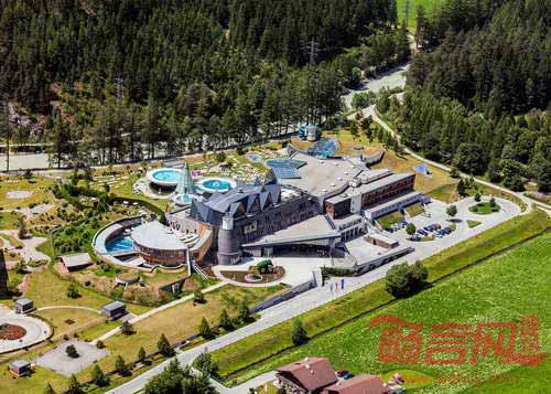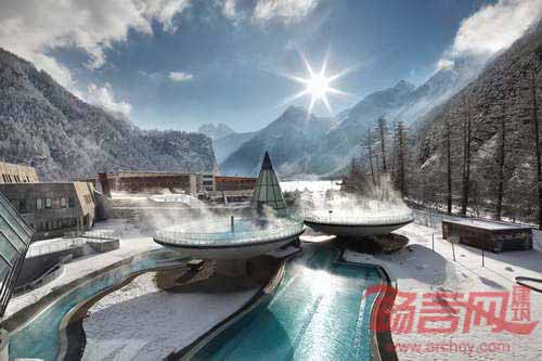 水穹顶温泉度假村位于风光如画的奥地利山间,其倾斜锥形的建筑形态参照了山区环境特点。项目每年接待35万游客,设计旨在创建当地标志性地标,为宾客创造熟悉的阿尔卑斯高山氛围。从外表看,锥形建筑连接了三个悬吊在空中的圆形水池,配有水下音乐和多种照明效果。锯齿形屋顶有观景台,形同周边的高山外形和材质。建筑整体采用了当地采集的石材。其他休闲设施包括传统25米泳池以及独立的儿童设施。总体而言,2200平米的水上设施采用地下1.9公里取水的水库经过过滤而成的温泉水。