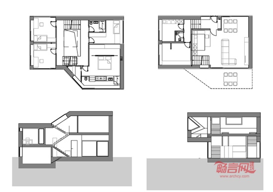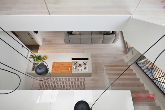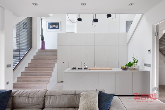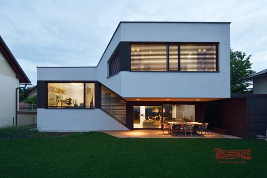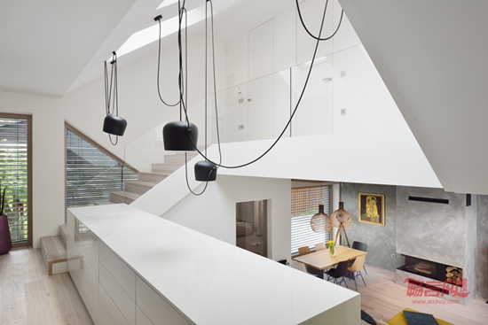 这座带骑楼的二层家庭住宅位于斯洛文尼亚首都卢布尔雅那的一片人口密集的居民区。设计中主要考虑了中央起居室与周围空间的关系,并且通过一个错层式阁楼将一层与中间层的活动区域融为一体。