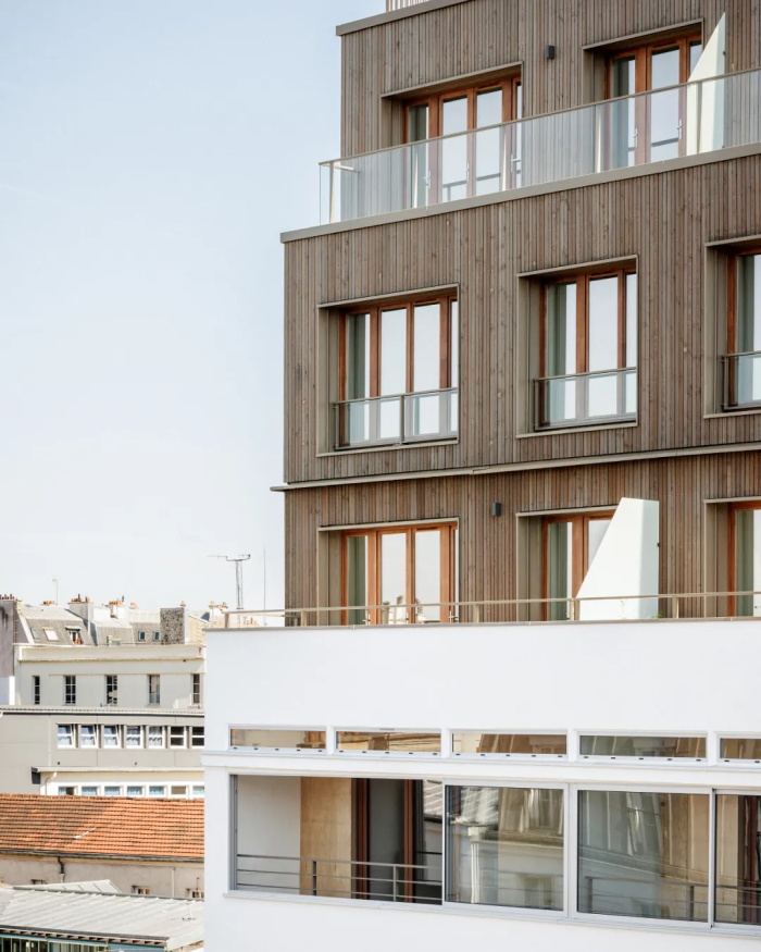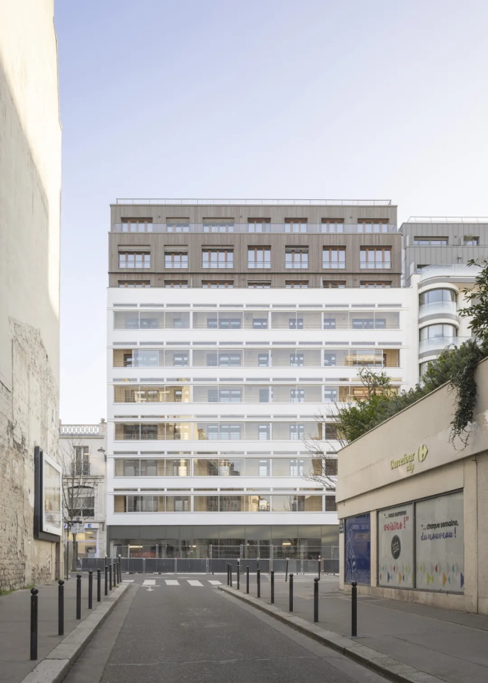这座前身为一个建于 1957 年的车库建筑,由首届罗马大奖得主、建筑师克劳德·贝罗(Claude Béraud)设计,坐落于巴黎第 11 区的帕尔芒捷大街 58-60 号。该项目涉及对建筑进行大规模的翻新与结构重组,同时还增建了一座三层高的扩建部分,其结构采用木-金属混合结构,配有框架式立面和木质包层。原有建筑体量得以保留,并进行了抬升处理,同时穿插设置了庭院和花园,从而能够开发出 63 套住宅单元以及一处商业空间。因此,该项目几乎完整保留了原有车库的结构。