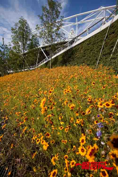 河岸草坪上铺满、种满了矢车菊、金盏花、加州罂粟、草原野花等鲜花,形成一片金色花海,为奥运会开幕式做好了准备。这是第一个有十多个足球场大、花蜜丰富的野花草场出现在奥林匹克公园里,这不仅为奥运会提供了一个色彩缤纷的优美环境,也为这些野花在未来两年提供了一个温暖的家。