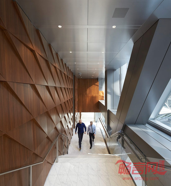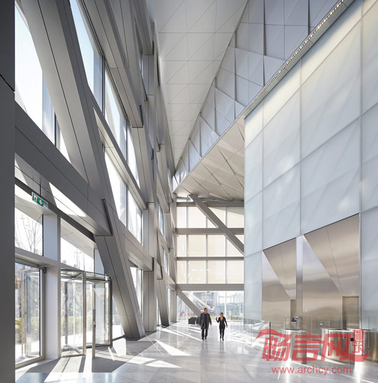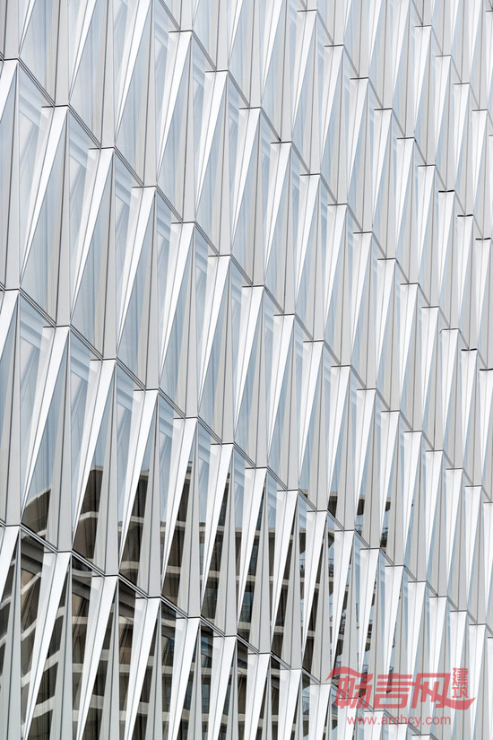 此外,由于项目地块是一个三角形,为了最大程度地利用有效空间,从而促成了大楼的最终造型。通过抬高东北部和南部的两个角,形成了两个公用场地,同时增强了项目的通透性和开放性。