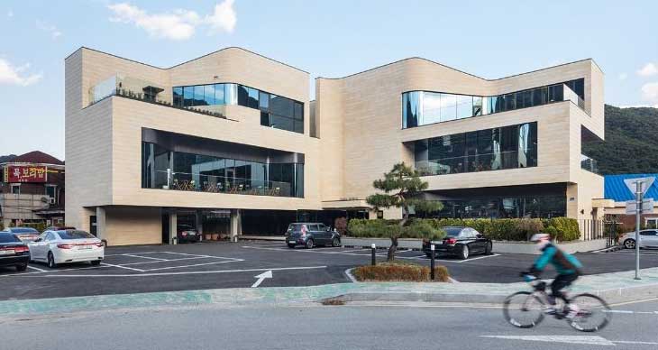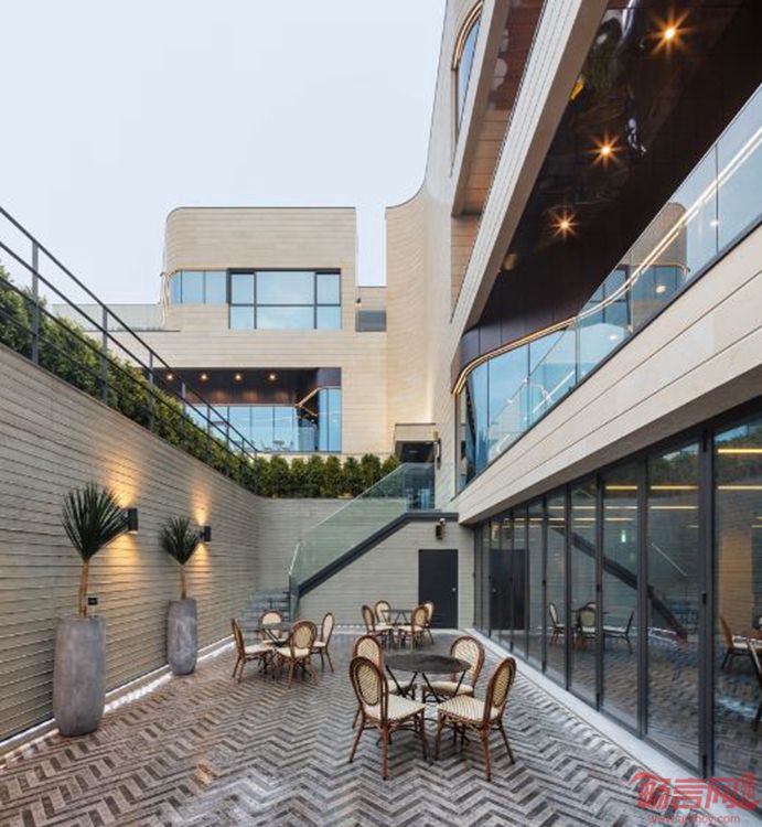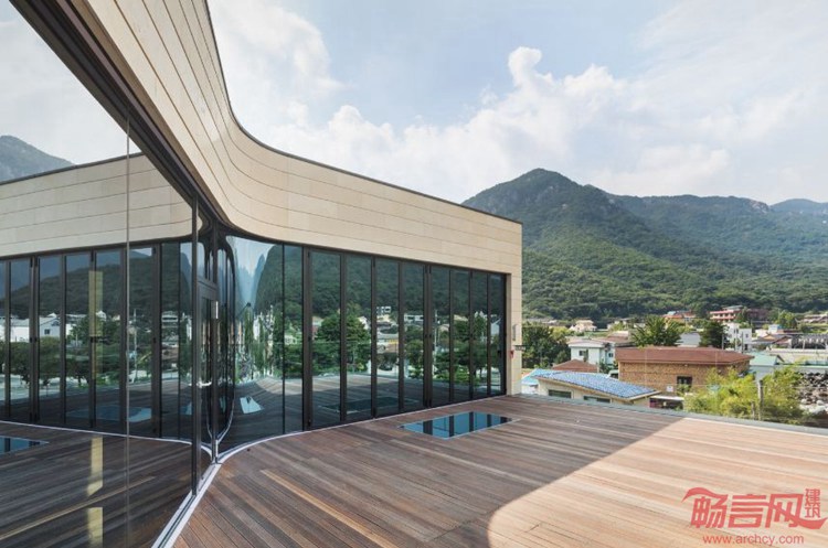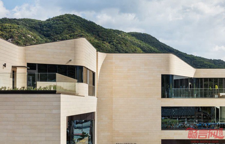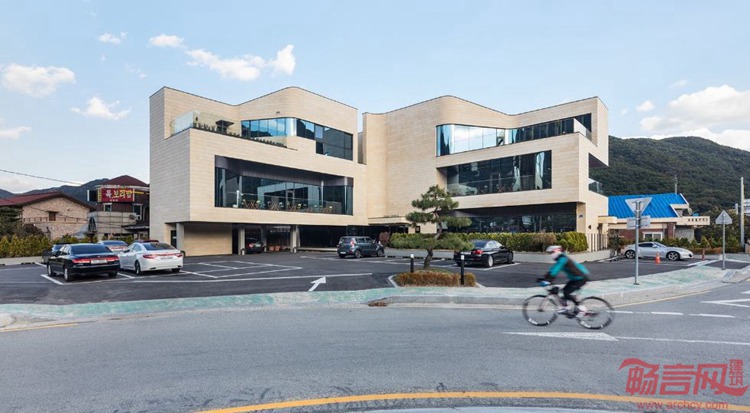 JOHO工作室设计了位于韩国忠清南道的波浪石头住宅。项目面积1068平米,于2015年完工。这座混合设施包含住宅和餐饮双重功能,坐落于韩国名山Keryong山中。四周都是山地,360度被山景围合。这一景观特点是设计灵感的主要来源,设计师希望将美丽的山景转变到商业项目中,并使项目成为国家公园的新象征。