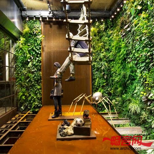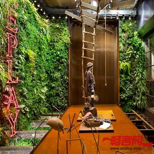 第二座墙表面的植物遮住了历经不同气候侵蚀的金属瓦,让店里更加漂亮。