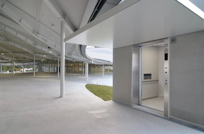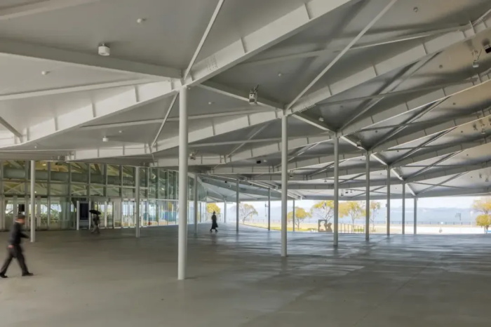 SANAA 设计的香川穴吹竞技场建筑规模远超丹下健三的体育馆,它占据了市中心一块已有 30 年历史的垃圾填埋场区域。这块曾经空置的地块面朝濑户内海,步行即可到达高松中央火车站和渡轮码头。船只可以从此出发前往本州岛以及“艺术之岛”直岛。渡轮乘客可以从水上欣赏体育馆的壮丽景色,SANAA 的建筑则享有与大海的畅通无阻的通廊。