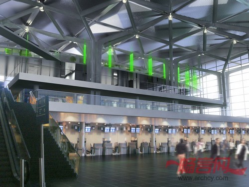 该商务中心平台位于候机楼内,沿机场中庭的墙板建造。通过一座长悬浮桥构成的通道,可以从现有的垂直客流中心区穿过机场的中庭。辅助的楼厅朝向机场的中庭开放,从这里可以进入到每个会议室。为了避免模式化的工作环境,建筑师采用了独特的方式,即通过改变建筑面积和形式来设计和完成每个独立的空间。楼板的下面安装了抛光的不锈钢吊顶,可以反射自然光,让旅客看到后面跑道上的飞机。
