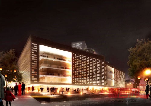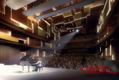 共同构成了宏大的交响乐大厅和会议大厅的三幢建筑将作为明确的定义元素而存在。该建筑的外部采用温暖的红色胶合板作为主材,构成了一种三维结构。