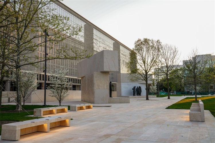 纪念馆计划于9月17日开放,由弗兰克•盖里事务所、AECOM联合设计,规模之大令人震惊。建筑主要特征是金属装饰物,高60英尺,宽450英尺,面积达3/4英亩的不锈钢编织物,由八层楼高的桥墩支撑着。纽约L'Observatoire国际公司提供了照明方案,盖里设计的素描轮廓在闪闪发光,产生了戏剧性的效果。