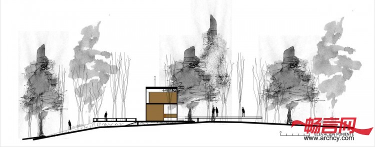 这所盒子建筑是一个在18毫米厚的胶合板幕墙上覆盖了金属板的简单的网状结构。阳光穿过树叶形成了斑驳的光影,并透过玻璃窗投射在屋内。这种框架结构是很通透的。建筑上的金属型材象征着新森林中树木的树干和树枝,而木质板材象征着大树的叶子。这就是为什么建筑幕墙的线条如此模糊并随着季节的变化而改变的原因。根据森林本身的热量变化移动建筑的网状结构,可以有效地控制建筑热量的进出。