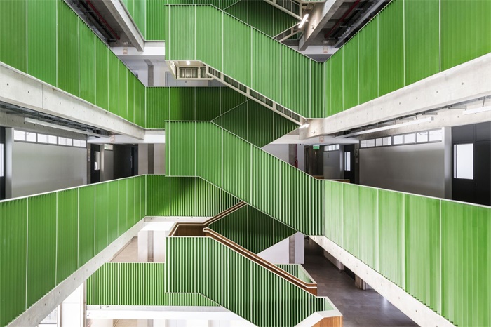 在建筑的内部空间,人们可以通过一个带天窗的温室到达屋顶。这种中间过渡空间的设计,回应了“建设可持续的、健康的、舒适的、教育的和综合的校园”的需求。