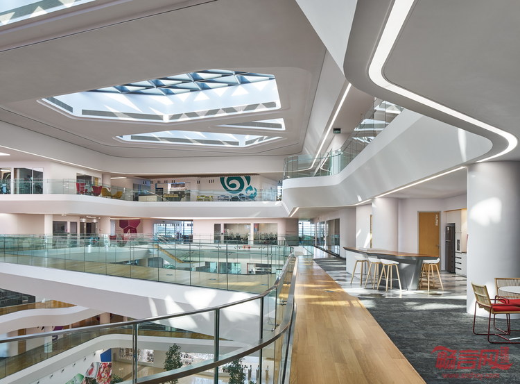 设计借助立面上的凹槽形成室内和室外的绿植空间。建筑的四座翼楼由处于凹位的广场相连。室外景观平台及屋顶平台同时可供员工及访客进行休闲放松。