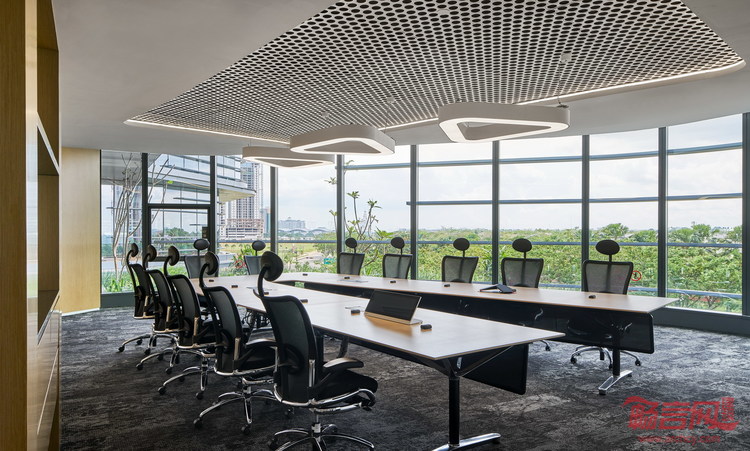 该建筑的幕墙系统可最大化自然采光。外立面采用不同深度的灰色铝片百叶包裹,提供遮阳并减少阳光直射。整座建筑中不设封闭式办公室,从而可以为所有员工提供最好的自然采光与景观视野。而闭合式的会议室则分布于核心筒周边。