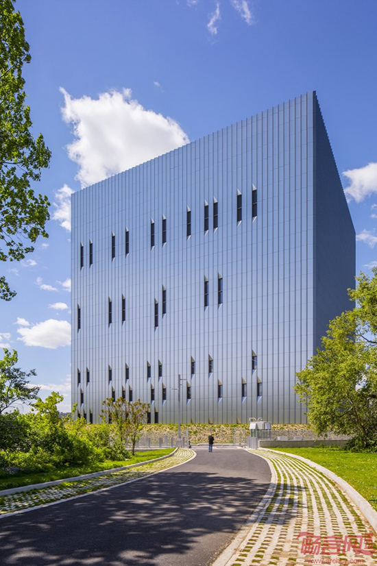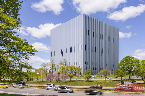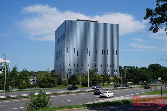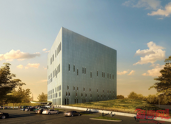 该应答中心建筑面积为450000平方英尺,具有抗爆性能,结构呈立方体。处于安全考虑,窗户设计得非常小。为了立方楼体的呆板性,SOM使用回收利用的铝材为楼体增加了锯齿状的外立面,增加了动态感和对称性。