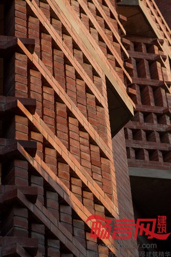 除了厚实的墙壁,房子外表的各个连接处也使用了红砖,赋予这座房子丰富的土陶色彩。阳光透过红砖制成的光栅,在房子正面和室内形成一个个格子状的光斑。