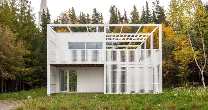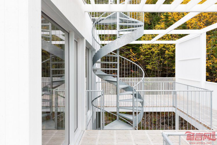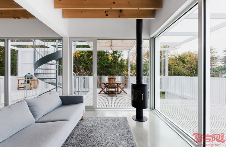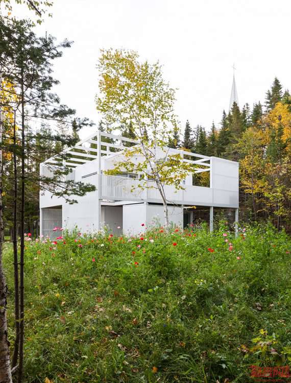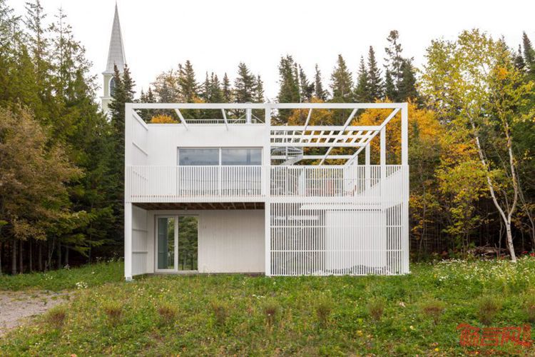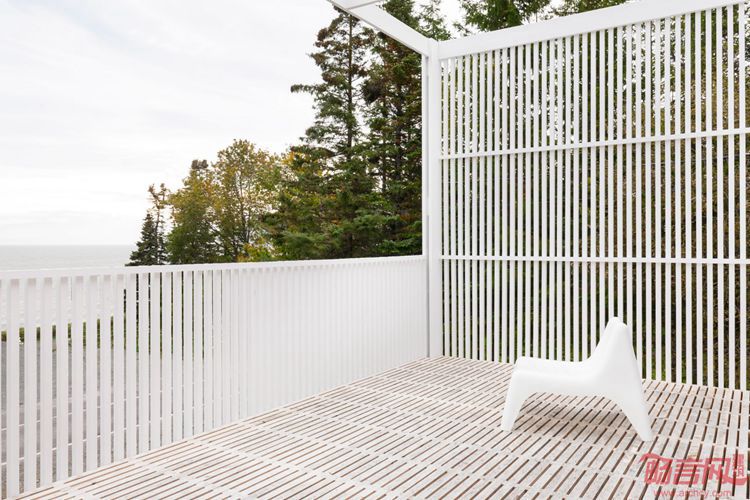 项目位于魁北克乡间的树丛中,建筑覆盖了白色格栅板,阳光透过板材照到屋内。两层的Le Lupin住宅于2016年完工,由Atelier Pierre Thibault事务所完成,是一个年轻家庭的度假屋。坐落于距离魁北克城两小时车程的Riviere-du-Loup,位于俯瞰圣劳伦斯河的场地上。户外露台围绕着紧凑的起居室。设计师表示,室内设计尽量简化,以突出室内外的连接感。