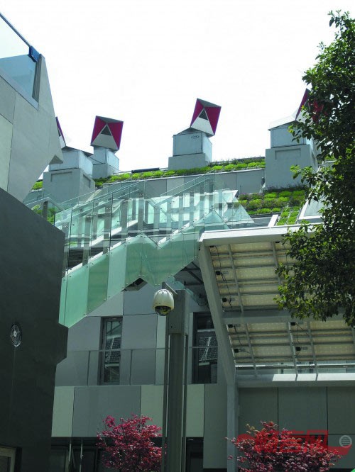 大型光伏太阳能电池板为建筑提供了绿色电力能源,而带有旋转风烟囱罩的通风系统则为建筑提供循环的新鲜空气。