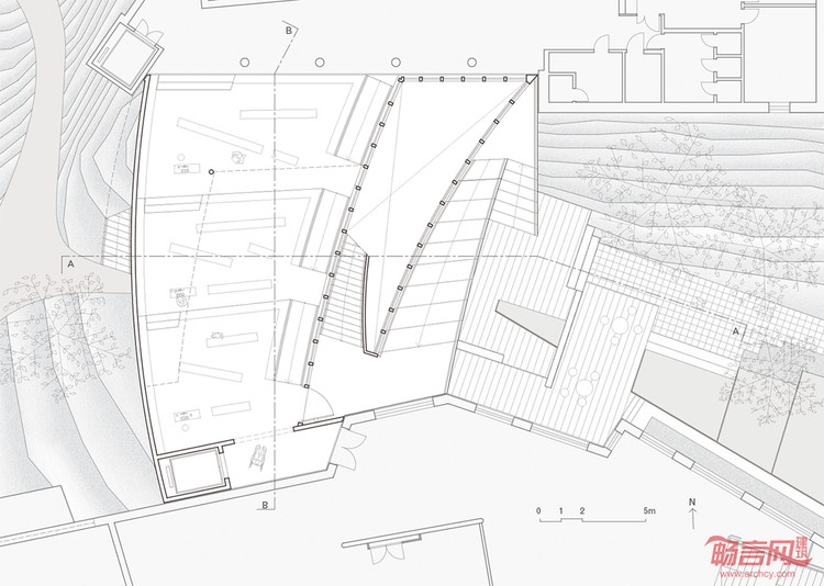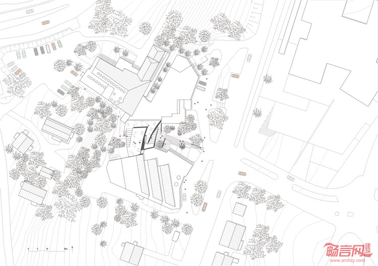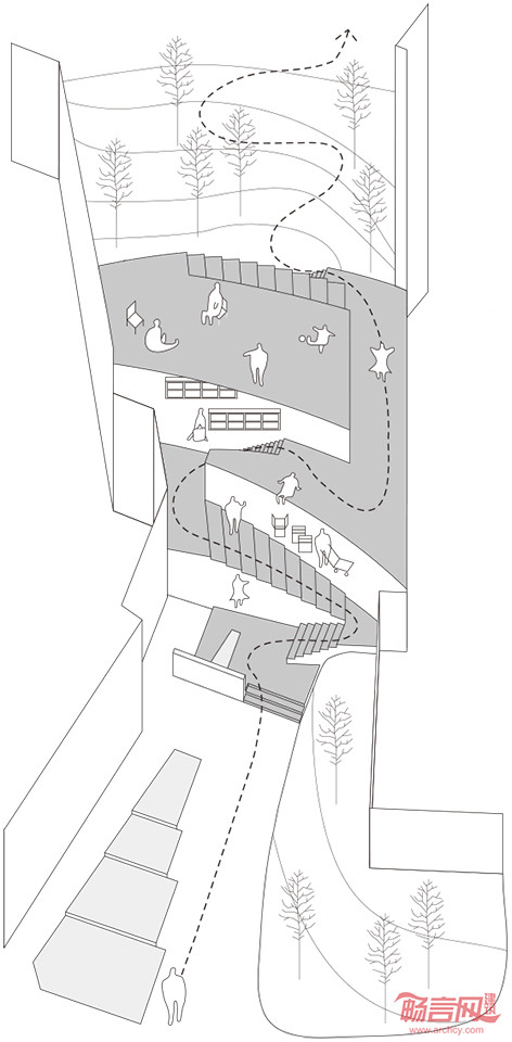 我们并没有将这个新的结构定义为一个建筑实体,而是一个人工的自然。通过一个开放的平台将自然引入。建筑的体量匍匐在等高线上,不是一个墙体,而是层层的退台链接成一个连续的公众流线。这个形态是对阿尔托的设计中几何的某种提取和转译,并延伸了博物馆原有的水池前导空间。观者通过水池,绕过树丛,拾级而上,蜿蜒绕转,最后到达的是一片浓茂的绿地:一个消隐的避世之所。