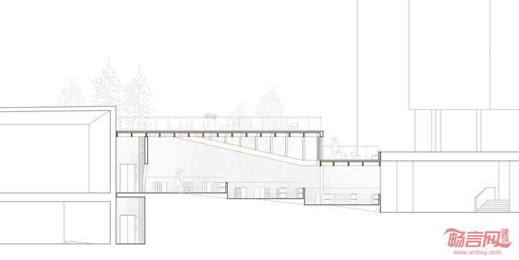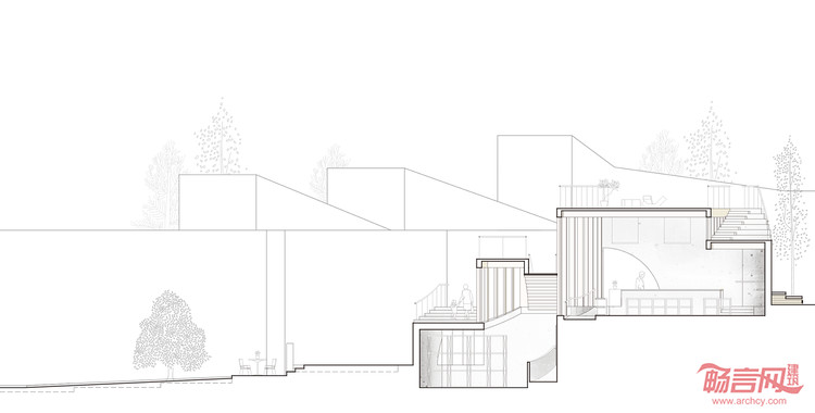在传统的博物馆空间中,公众与技术的功能是严格区隔的。在本次设计中我们将空间定义为交换的媒介。一般的处理是将幕后的一些功能隐藏,或者索性埋在地下,与之不同的是,我们将文物修复等功能打开,并通过剖面的处理使其与公众的视线连接。使博物馆的馆藏与公众的活动交织。这是一个公众,研究者,与艺术家发生共鸣的共享空间。我们认为馆藏并不是冰冷的人工物,观者也不是匆匆过客,而被统筹于文化事件的一部分。
