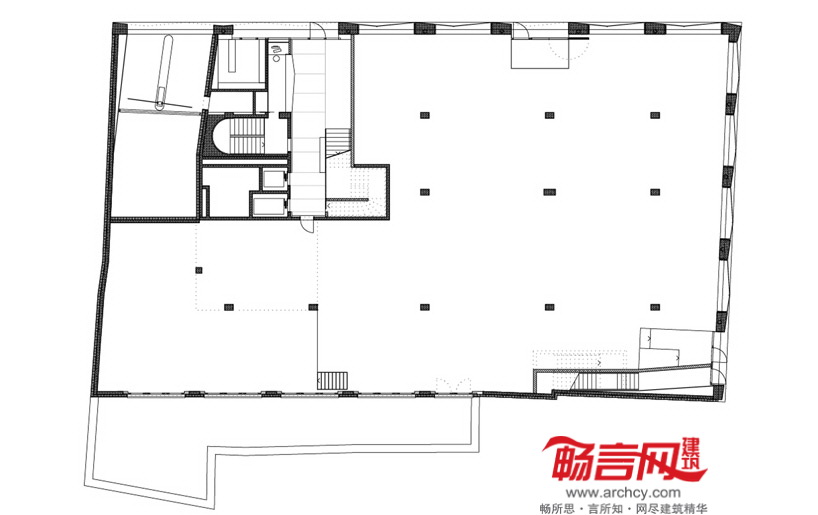 建筑主要用于办公空间,一层具有较高的层高,零售店和展示厅被厚重的混凝土剪力墙隔开,其中间隔均匀地排列了若干窗户。