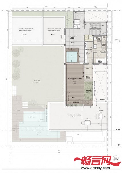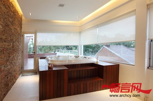 建筑师还对光线的路径进行了仔细的研究,尤其是在设计游泳池位置的时候。水景再一次在住宅的建设中起到了很大的作用。建筑师把游泳池位置设计的比地面高,并为它添加了一面玻璃池壁,这样就可以透过它,从池内看到池外,也可以从池外观察池内。从住宅的不同地点看,它的风景也都不同,从住宅外面看,它就是住宅的亮点。
