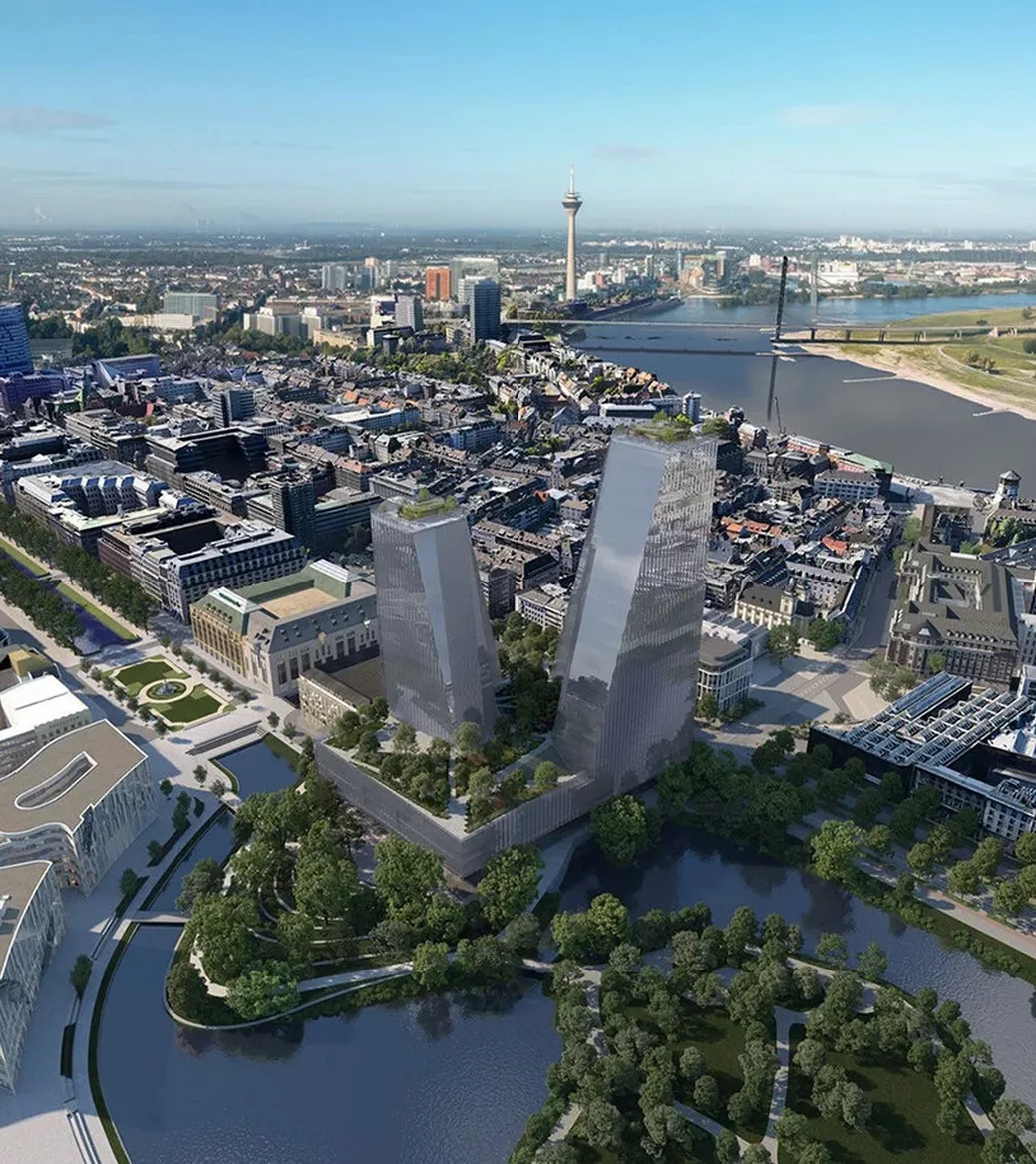 水平层往上,极富特色的V型塔楼直指天空。从不同角度看去,两栋塔楼的整体外观不断变化。塔楼的设计在策略上减少了落在公园和周边街区的阴影,同时为庭院创造了更好的光照条件。