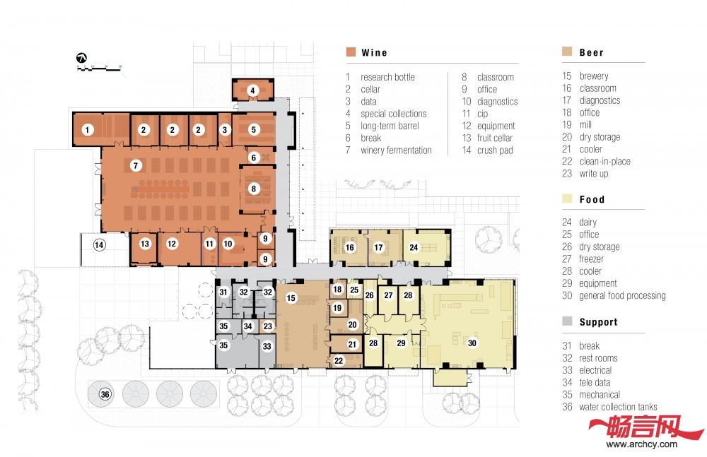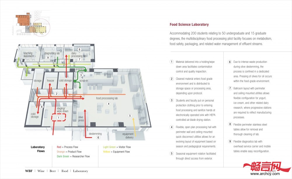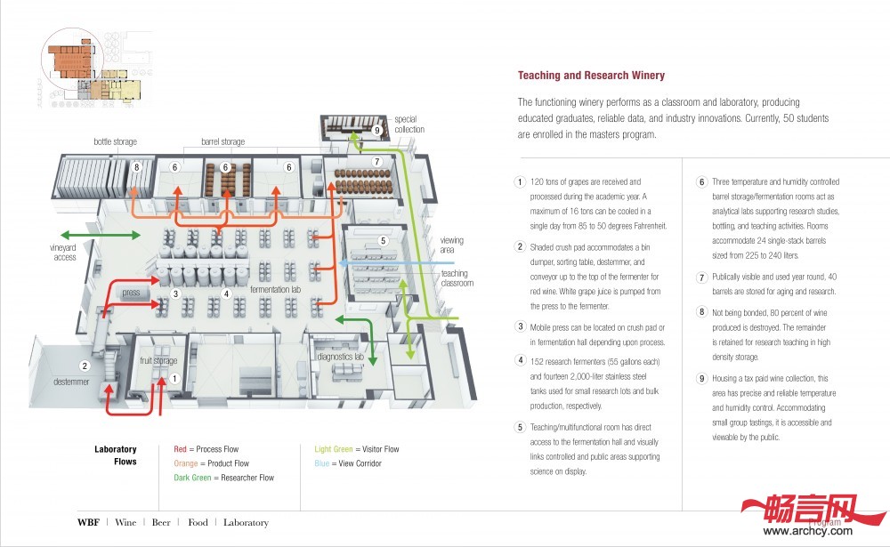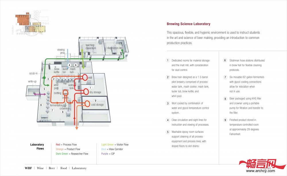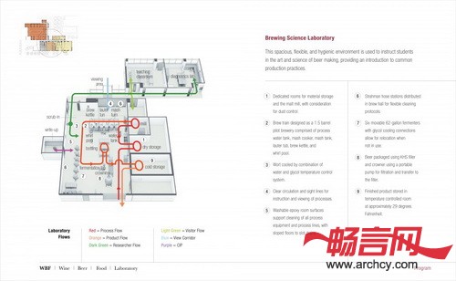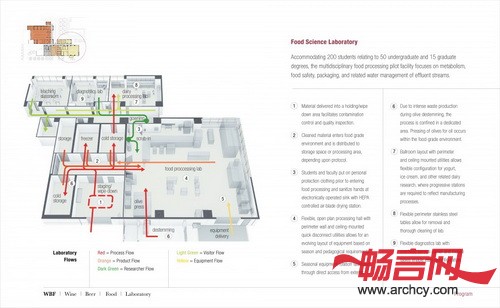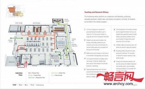 WEB被设计成一个综合性的研究和教育学术建筑,它将传统的科学探索和现代应用工艺技术结合起来,这样学生和研究员们就能直接的检测一些理论、应用最新的生产工艺。建筑里面除了有食品和饮料学术研究设备之外,这里还向学生和研究院介绍了可持续的生产工艺以及全套设备运行步骤。