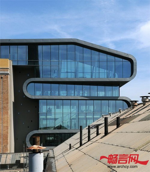 新办公楼非常亮眼,它将旁边的工业楼半包围住,成为了公司的新建筑标志。它也成为了场地中轴线上一个让人停留的空间。设计办公楼的时候,Conix把它旁边的道路缩窄了一些,并进行了对道路进行了设计,这样就为办公楼建造出了一条入口小路,而这正是以前没有的。与周围其它保留下来的、单调的建筑物相比,新办公楼的外形亮眼又奇特,它不但视觉上能吸引住人们的目光,从情感上也给人以舒适感。