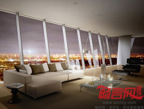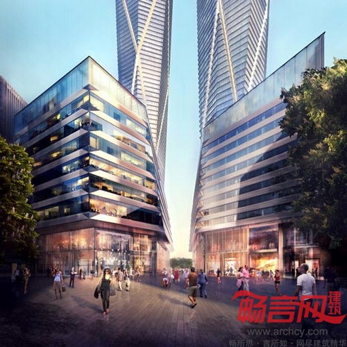 双子塔楼体呈钻石形状,两座大厦仿佛扭曲着升入上空,而且越往上延伸,楼面之间形成的锐角越明显。