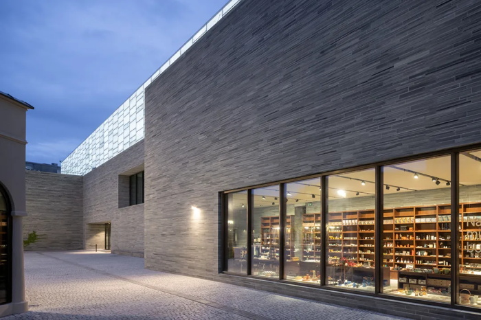 建筑上层的“光之大厅”是一个巨大的临时展览大厅,其外墙呈现半透明效果,这是因为玻璃板之间夹着薄切的葡萄牙Estremoz大理石。到了晚上,内外两层立面之间的LED灯被点亮,使得这个体量如同一个雪白的石膏立方体。