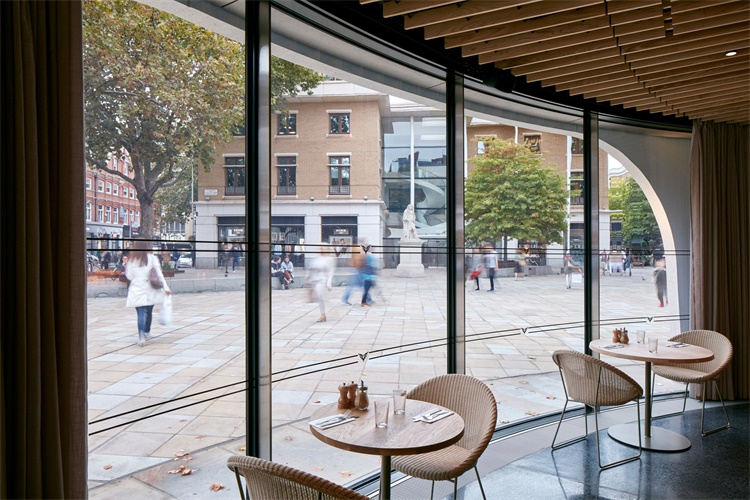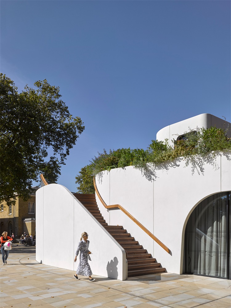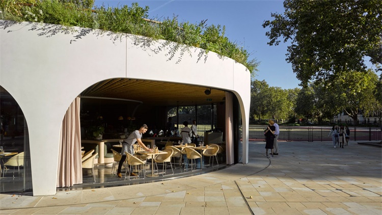 NEX工作室设计了伦敦切尔西区的Cadogan咖啡馆,项目亮点是屋顶花园。建筑拥有弧形窗户,天气晴好的时候,可以完全缩到地下,让餐厅和室外广场连成一片。细长的拱廊铺设了15厘米厚的混凝土块,咖啡馆坐落于约克公爵广场(Duke of York Square),临近萨奇美术馆(Saatchi Gallery)。与垂直推拉窗类似的链条系统使窗户可以缩到地下。咖啡厅螺旋形式采用了定制的钢结构。AKT II工程公司为NEX工作室设计了无需水平窗横木的钢结构。