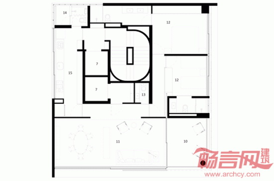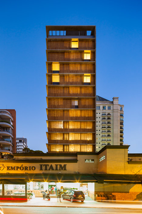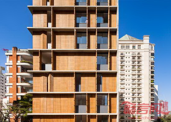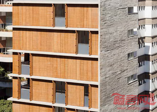 MK27工作室设计了位于巴西圣保罗的Vitacon Itaim公寓。建筑的一大特点是北立面设有穿孔木窗,北侧是最需要遮阳的朝向,住户可自由控制起居室的采光。项目坐落于圣保罗Chacara Itaim街区,包含10套公寓。多数面积为144平米,顶部有宽敞的复式住宅。设计师参考阿拉伯窗扉,设计出覆盖若干开口的木质百叶窗。这种窗扉最早被葡萄牙定居者带到巴西。